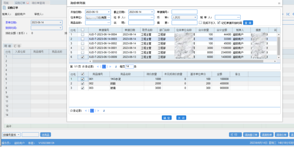 2、所有请购单汇总成一张报表,点开请购单报表,看到单据+材料明细,勾选材料完成审核。