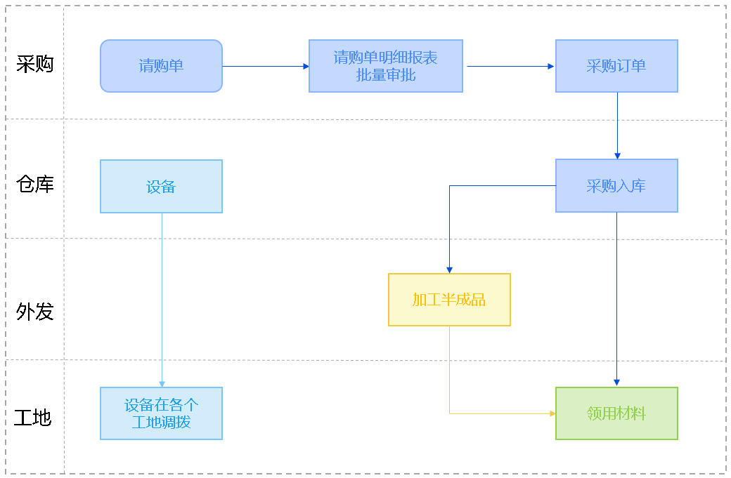 公司总仓库把各类的配件、原料及设备发到各个工地,设备直接从A工地调到B工地,需要通过查看总仓就能清楚材料发往何处、剩余多少库存、设备即将送达的工地是哪?